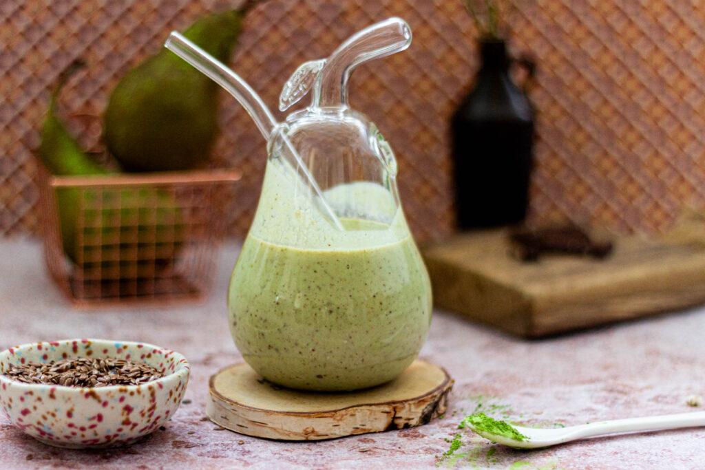 Korzyści zdrowotne koktajlu z gruszką, skyrem, matchą i siemieniem lnianym